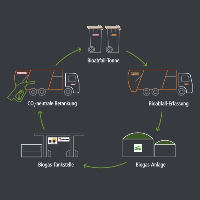 Los roles en el proyecto están claramente distribuidos: RheinEnergie es el operador de la estación de biogás; GVG Rhein-Erft, que posee una instalación similar en Hürth desde 2019, es responsable de su gestión. AWB y REMONDIS Rheinland son los operadores de la flota de los vehículos de eliminación y recogen los biorresiduos. AVG, a su vez, opera la planta de compostaje y fermentación, a partir de la cual se genera la energía de propulsión del vehículo.